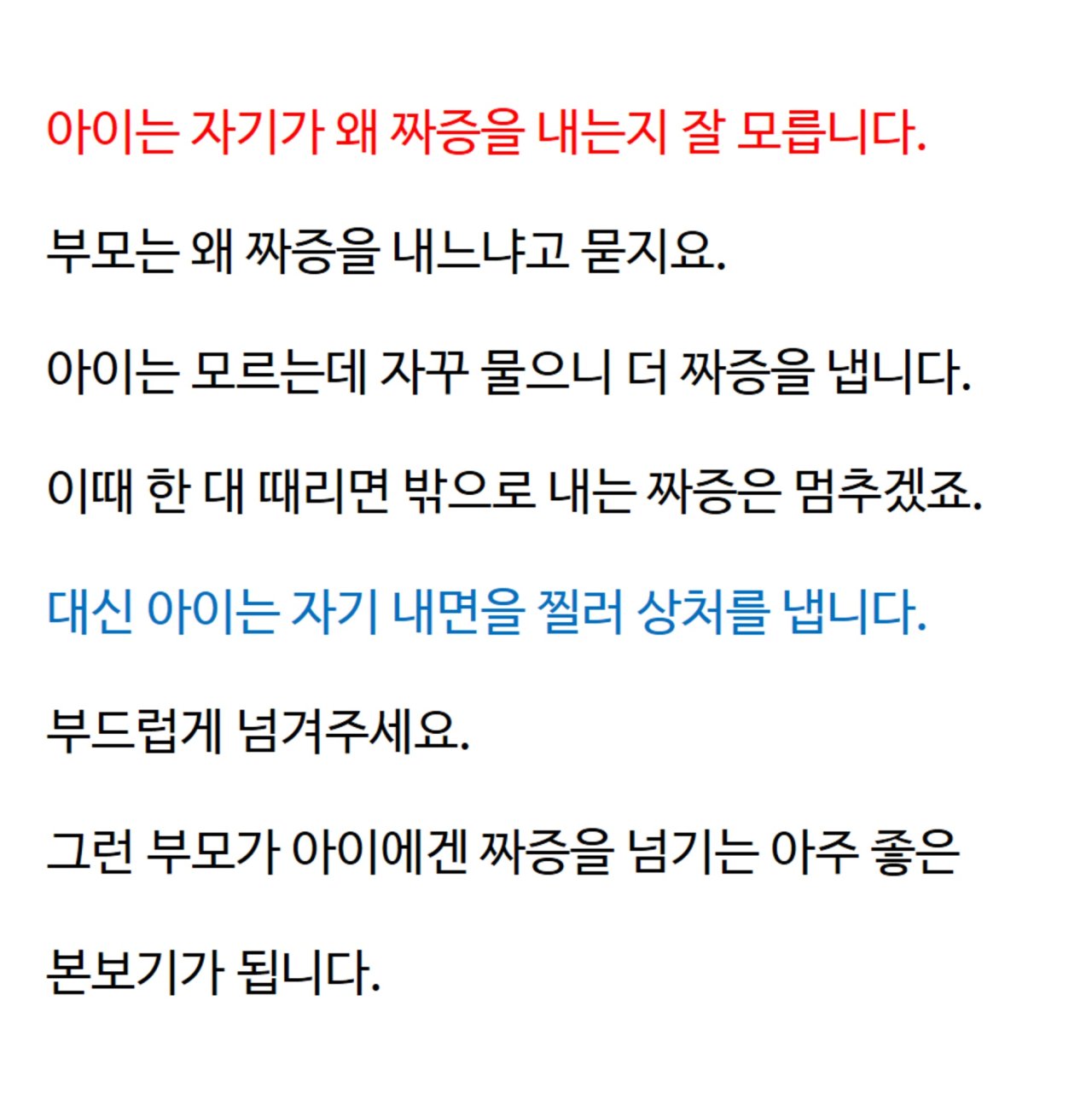 엄마도 사람인지라 아이가 지속적으로 짜증을 내면 화가 날 수 밖에 없습니다. 그럴 땐 어떻게 해야 할까요? 저장해두시고 화가 심하게 날 때 마다 읽어보세요.